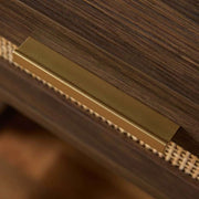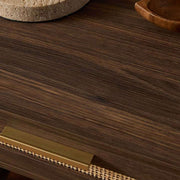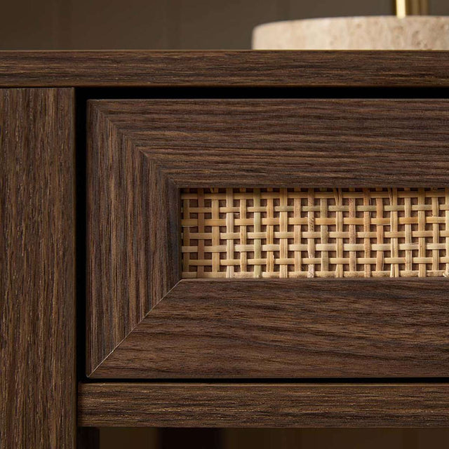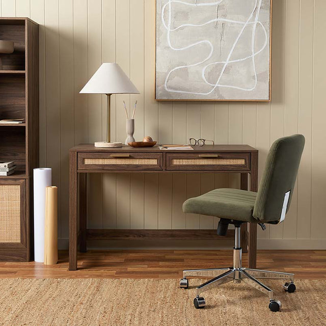The Noosa Rattan Desk - Walnut is a stylish addition to any home office or study. Featuring a mid-century inspired design, it offers two slim sliding drawers with beautiful rattan front panels and brushed gold metal handles. Finished in a rich walnut wood-look, this desk pairs perfectly with the Noosa Bookcase for a cohesive, timeless style.