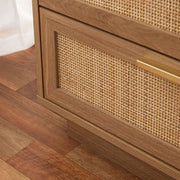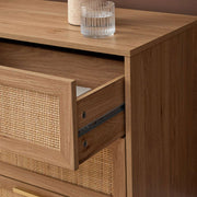 Featuring a warm wood-look finish, rattan drawer fronts, and brushed gold handles, this dresser blends modern coastal style with practicality, enhancing any bedroom or living area with a natural charm.