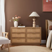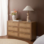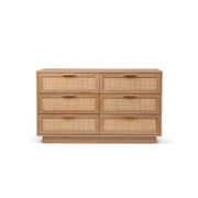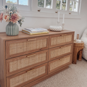 The Noosa Rattan Six Drawer - Natural brings a modern coastal vibe to your bedroom or living space. With six smooth-sliding drawers, a warm wood-look finish, and stylish rattan fronts paired with brushed gold handles, this versatile dresser combines practicality with timeless design. Perfect for keeping your room organised while adding a touch of natural charm.