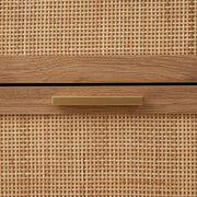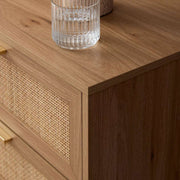Featuring a warm wood-look finish, rattan drawer fronts, and brushed gold handles, this dresser blends modern coastal style with practicality, enhancing any bedroom or living area with a natural charm.