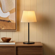 The Porto Metal Two Piece Lamp Set features a modern black metal frame paired with elegant cotton fluted lampshades. Their cohesive design blends seamlessly with various interior styles, adding sophistication and charm to your home.