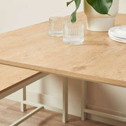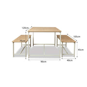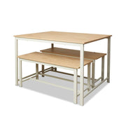 The Reese 4 Seater Dining Set in Beige is perfect for small spaces. It features a compact table and matching bench seats that slot underneath. The metal frame and wood-look tops create an urban industrial style, and the soft beige tones will make any room warm and cosy.