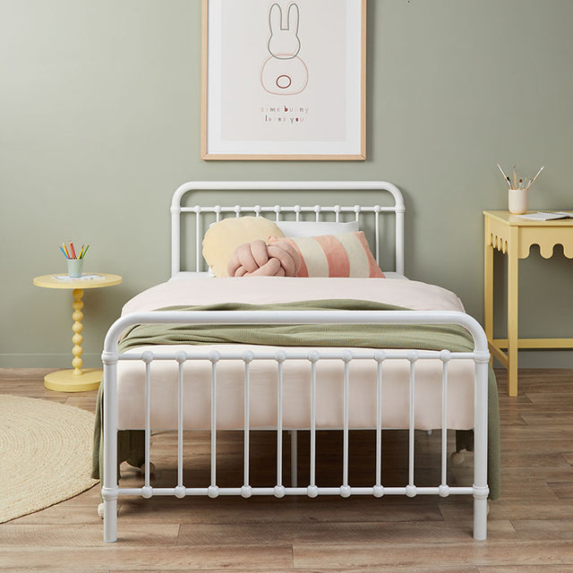 Mocka Sonata Bed - King Single - White makes it easy to create a modern, classic, vintage or country styled bedroom. Make a statement in any kids, teenagers or guest bedroom with the vintage details and neutral colour. Made from powder coated steel with a timber slat base, the Sonata Bed is stylish, durable and comfortable. Create a room that your child would love to relax in with a Mocka Sonata Bed - King Single - White. Check out our Blog post -Create a cool kids bedroom for less.