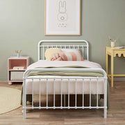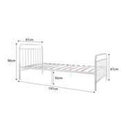 Mocka's Sonata Single Bed in white makes it easy to create a modern, classic, vintage or country styled bedroom. The vintage details and neutral colour of this bed will make a statement in any kids, teenagers or guest bedroom. Create a monochrome styled bedroom and style with your favourite decor and linen. Made from powder coated steel with a timber slat base, the Sonata Bed - SIngle - White is stylish, durable and comfortable. Create a room that your child would love to relax in with a Mocka Sonata Bed - Single - White. Check out our Blog post -Create a cool kids bedroom for less.