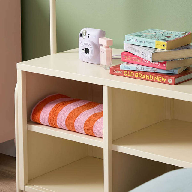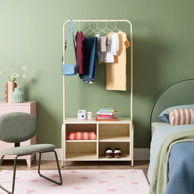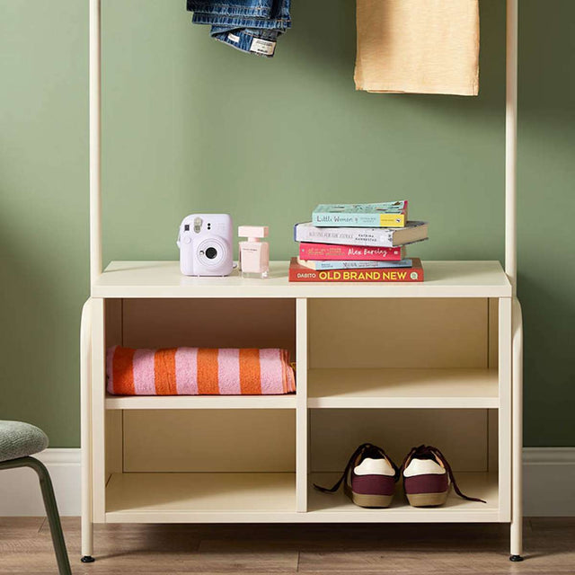 Introducing The Daily Rail in a fresh cream colour, a compact and stylish solution for your clothing storage needs. Perfect for planning outfits for the day or week, this rail features four open storage areas. Ideal for bedrooms, it coordinates seamlessly with a wardrobe or two-door cabinet for a complete storage setup.