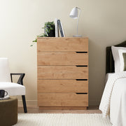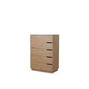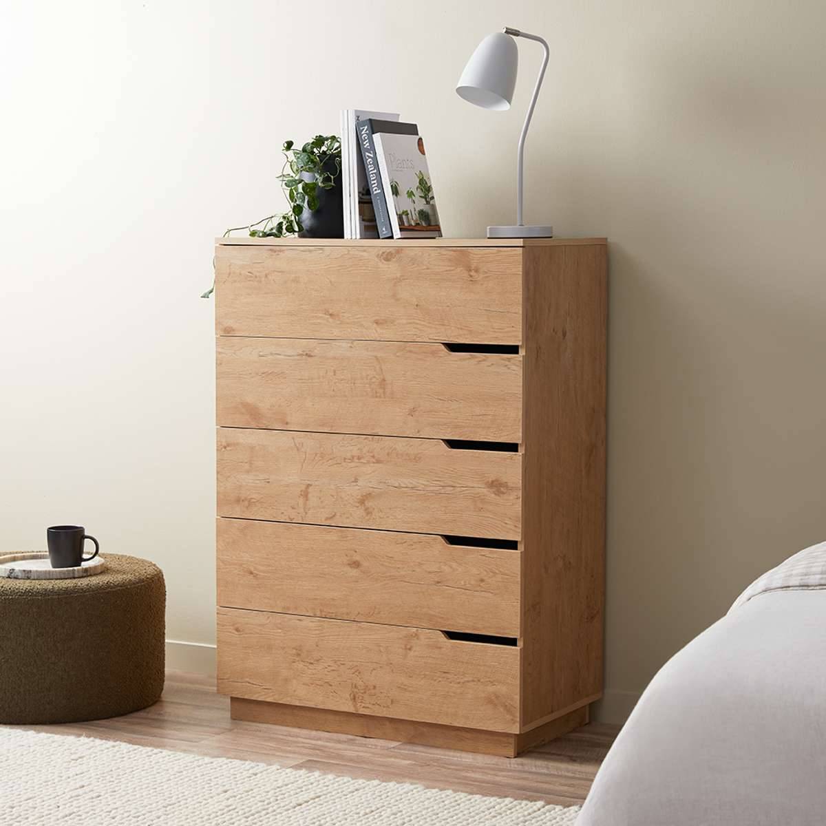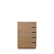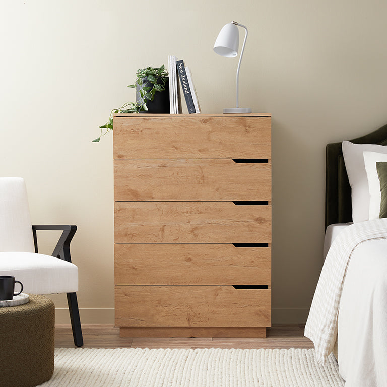 Introducing the Zack Tallboy - Natural. With a Scandi-inspired design in a natural finish, it features five deep sliding drawers with modern cut-out handles. Promising generous storage without compromising on style, it's the perfect addition to any living space. Experience warm, minimalist design with Zack.